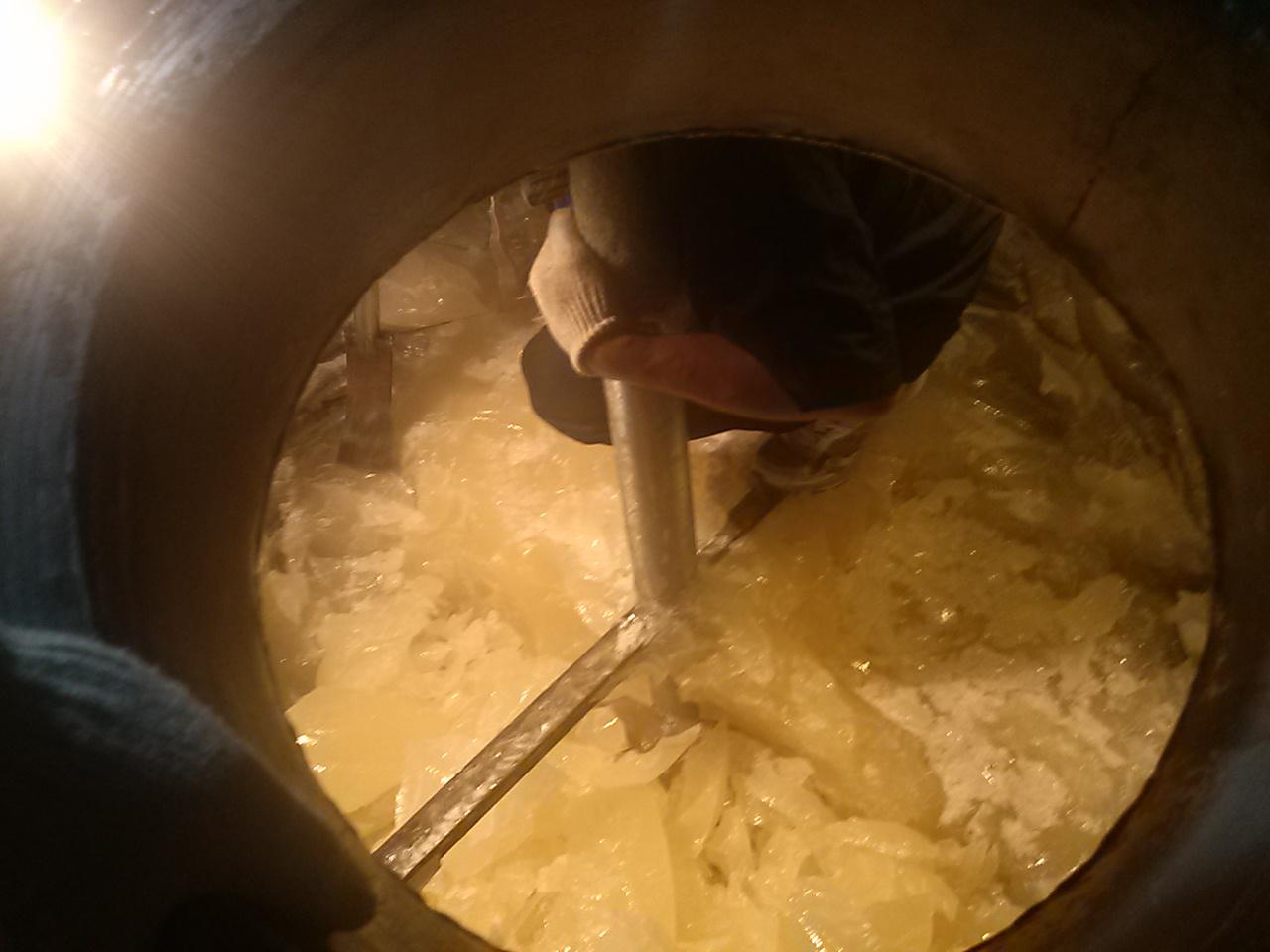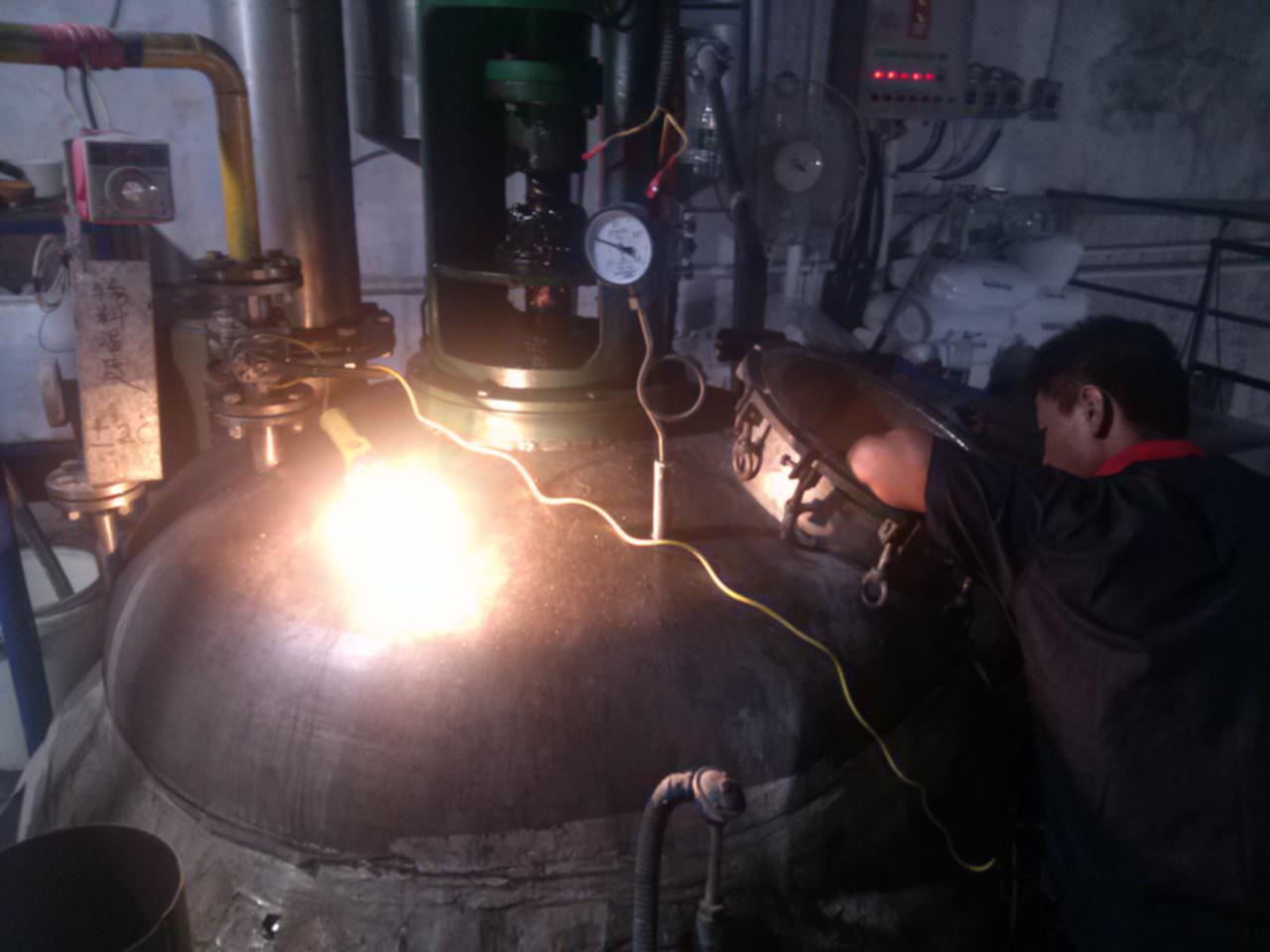 东莞国邦是一家专业生产眼镜镜框弹性油漆的公司。 该公司在5月底一次生产中,因原料质量问题导致反应釜内3吨多树脂全部固化,损失巨大,更严重的是生产受阻,影响公司正常运营。情况紧急,时间紧迫,必须尽快清除树脂,恢复生产,我公司临危受命,进行清理。